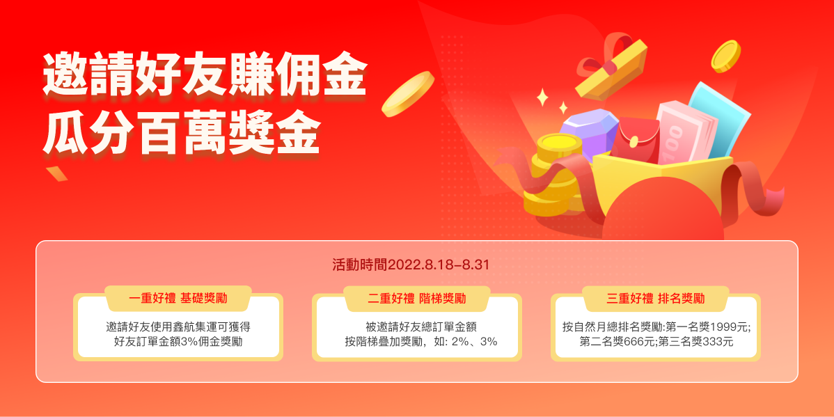 邀請好友使用鑫航集運可獲得好友訂單金額3%佣金獎勵